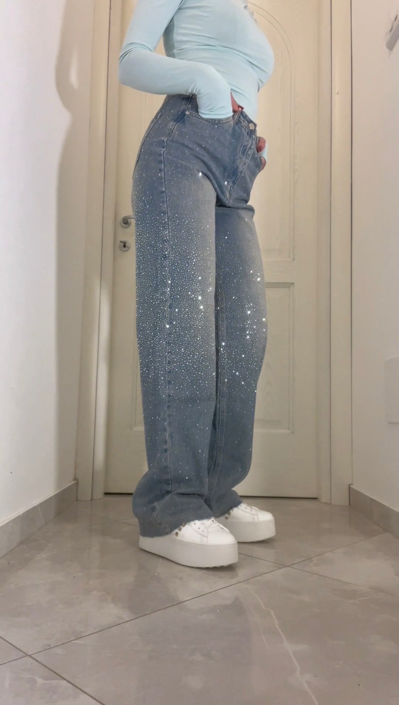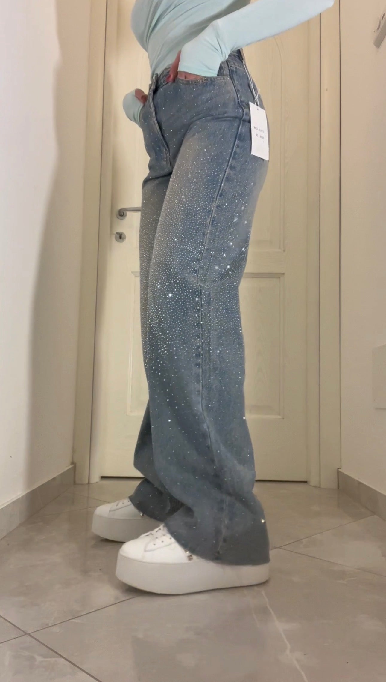 i jeans sono arricchiti da brillantini di alta qualità, applicati con una lavorazione studiata per garantire resistenza ai lavaggi e all’uso quotidiano, mantenendo nel tempo aderenza, brillantezza e luminosità, senza staccarsi o perdere l’effetto scintillante
